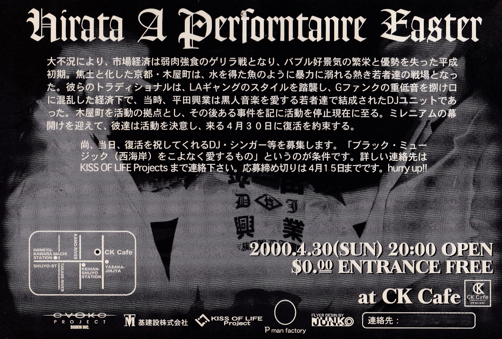 DJ KENTA DJ HIRATA DJ KING-G DJ CHRONICAを中心に1990年~99年に木屋町・北山を中心に活動していた。